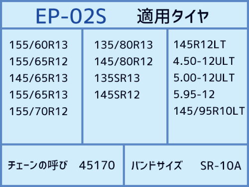 品番 EP-02S 商品名 EPタイヤチェーン取っ手付きプラスチックケース入り スプリングバンド付 チェーンの呼び 45170 バンドサイズ SR-10A 重量 4.3kg (1ペア) 付属品 ●標準JISタイヤチェーン●スプリングバンド(A付) 2個(※画像のフックの枚数はイメージになります。