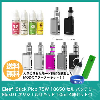 【送料無料】 電子タバコ スターターキッド Eleaf iStick Pico MOD 75W イーリーフ アイスティック ピコ MURATA VTC5 セル バッテリー 電池 Flex01 リキッド 10ml 4味 合計40mlセット VAPE 本体 テクニカル 予備コイル付 爆煙 Hilax